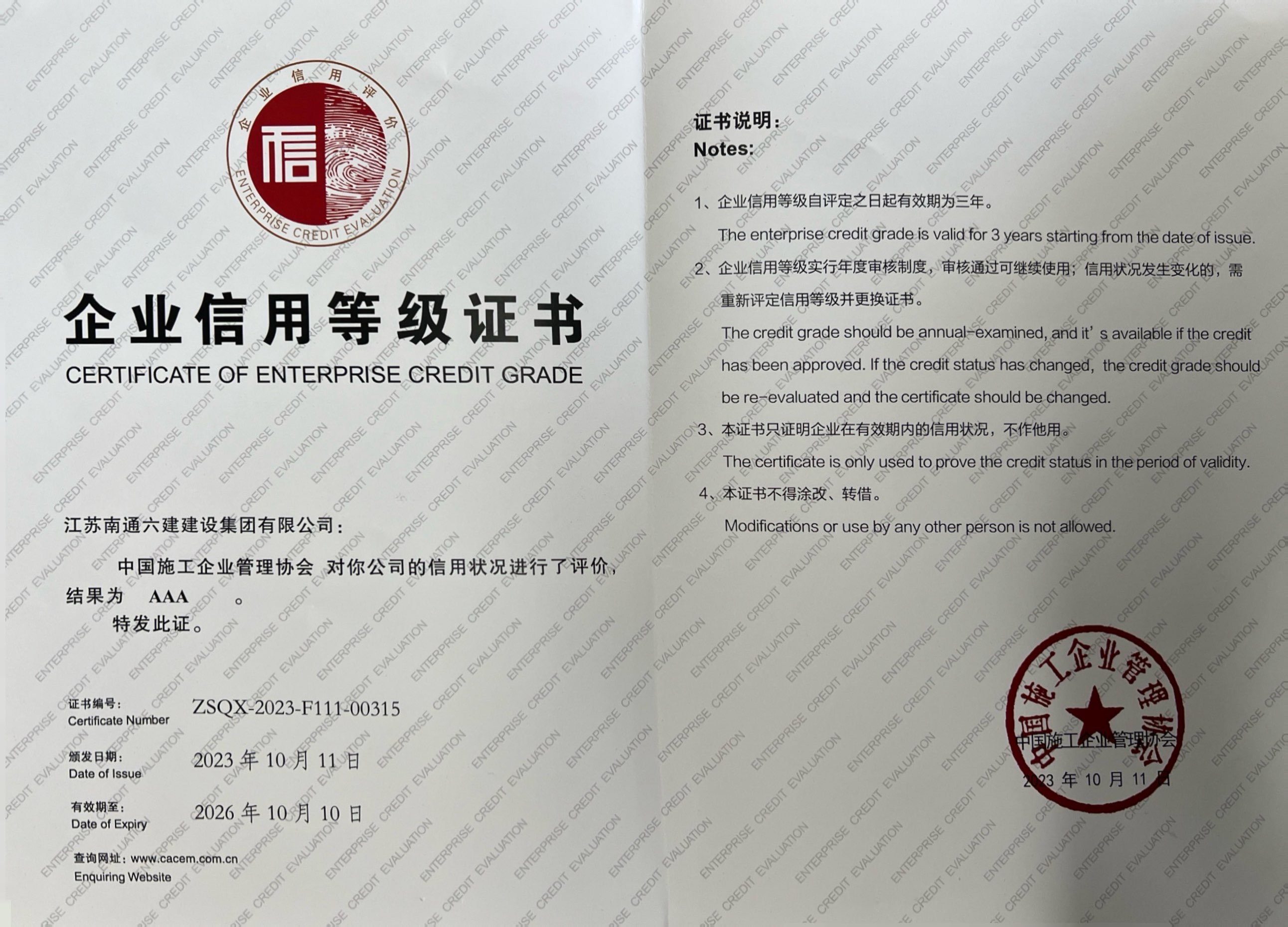 “中國建筑業(yè)AAA級信用企業(yè)”是中國建筑業(yè)協(xié)會(huì )評定的我國建筑業(yè)企業(yè)綜合能力最高獎項,通過(guò)對企業(yè)綜合實(shí)力、經(jīng)營(yíng)能力、財稅營(yíng)收、信用記錄、管理目標、競爭指數、市場(chǎng)行為等方面指標進(jìn)行考核,最終審定的行業(yè)內誠信經(jīng)營(yíng)的標桿企業(yè)。